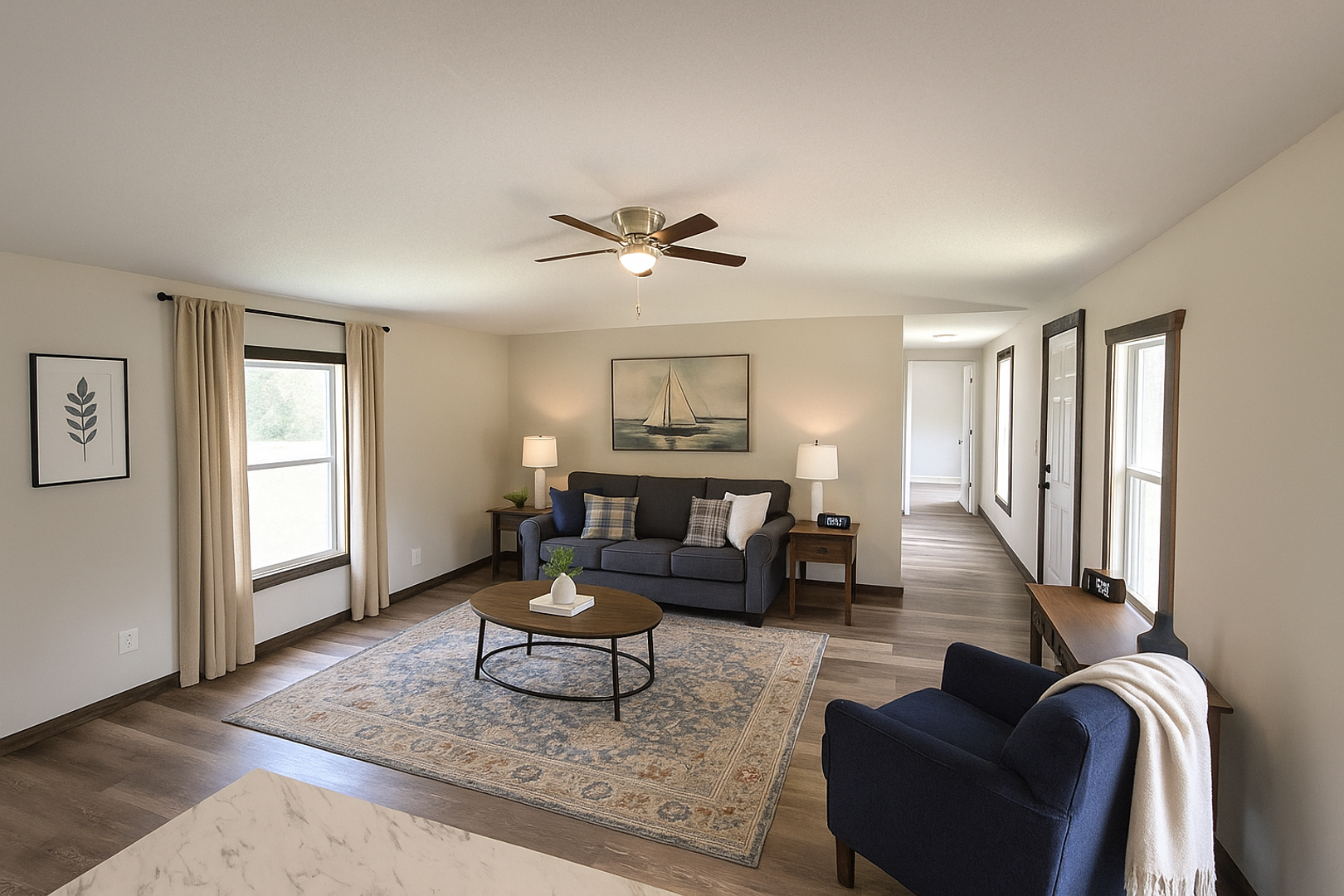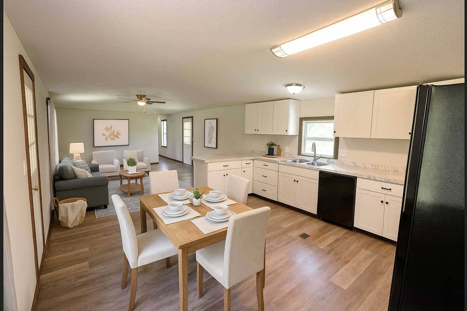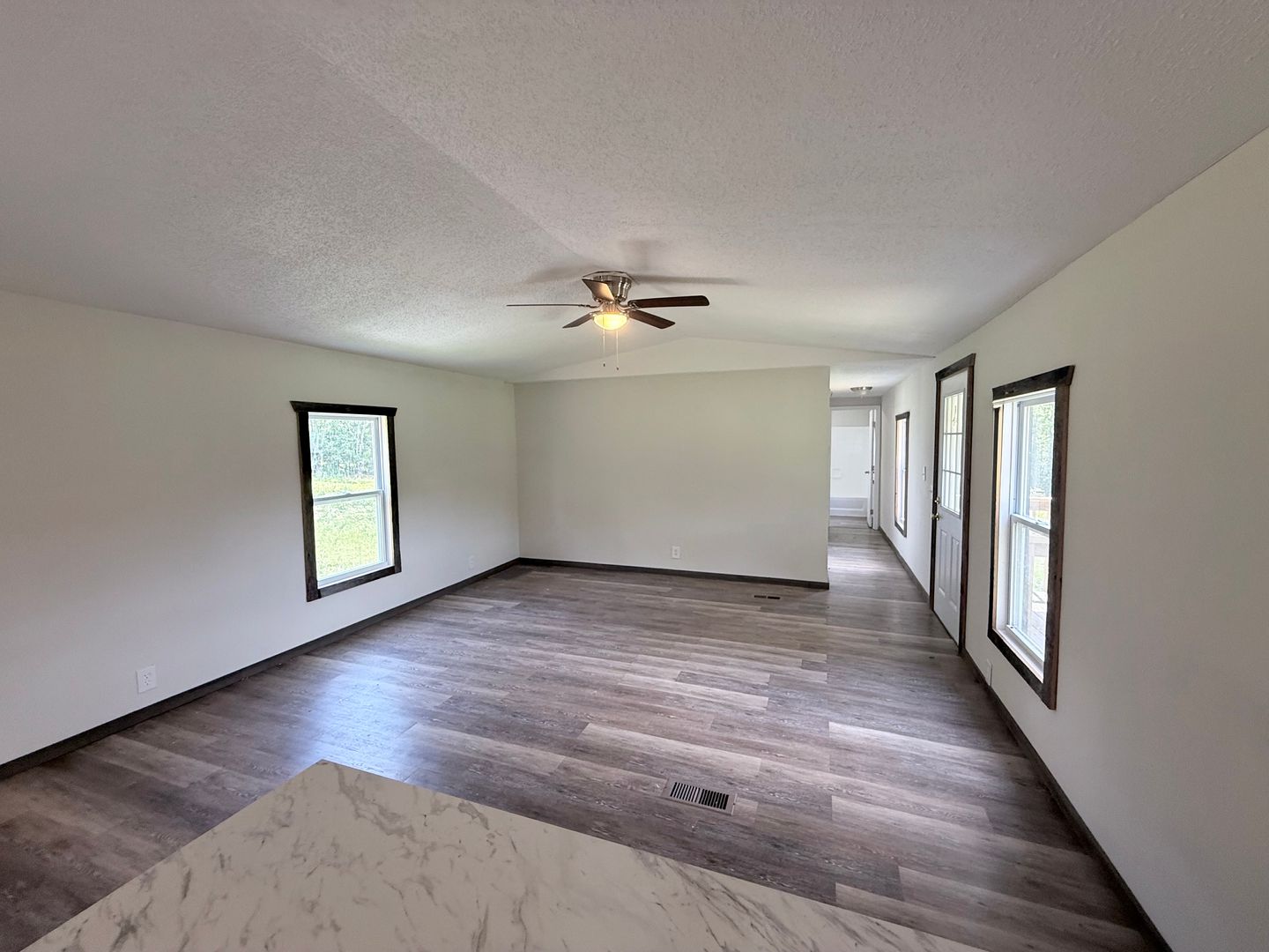 • Bright, open-concept living and kitchen area with marble-look countertops